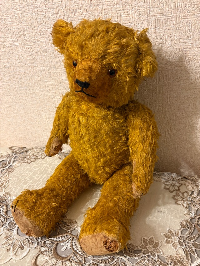 ラトビア・リガで出会った、歴史の証人のようなテディベアです。 はっきりと盛り上がった背中のコブ(Hump)、長く伸びた腕、そして手首の絶妙なカーブ。 その堂々とした「オールド・ジャーマン」スタイルの佇まいは、戦前の1930年代の古い様式を色濃く残しています。 ドイツ文化の影響が強かった戦前のラトビアで作られたものか、あるいはドイツから海を渡ってきたものか。 その造形の確かさからは、古き良き時代の職人技が感じられます。 手足のパッドには一般的なフェルトではなく、織り目の見える「布(リネン/コットン)」が使用されています。 これは主に、羊毛が貴重だった第二次大戦中から戦後(1940年代頃)のベアに見られる特徴ですが、戦前の物資統制が始まった1930年代後半に作られた可能性も否定できません。 平和な時代に生まれたのか、それとも激動の時代に希望として作られたのか。 その出自には多くの謎とロマンが秘められています。 琥珀色の目は静かで深い眼差しを持ち、長い年月を経たモヘアは味わい深く落ち着いています。 鼻の刺繍は、古い時代の東欧やドイツのベアに見られる、素朴な「垂直のブロック型」ステッチ。 お腹には、硬く締まった木毛(Wood Wool)が詰められており、抱き上げると「ギュッ」という、昔ながらの硬い感触が手に伝わります。 このベアの最大の特徴は、お腹の中に「グロウラー(鳴き笛)」が眠っていることです。 体をゆっくりと前後に傾けると、「クゥ…」と小さく、しかし確かに、低い鳴き声を上げてくれます。(毎回は鳴きません) 戦中・戦後の混乱期に作られた紙製の部品が、約80年経った今でも息づいているのは奇跡的です。 ドイツ・ゾンネベルクの伝統的な職人技が、ラトビアの地で守り抜かれてきた証と言えるでしょう。 西側の華やかなブランドベアとは一味違う、東欧の歴史と哀愁を背負った一品。 戦前から戦後の長い時間をラトビアの地で生き抜いてきした。 ラトビアのマーケットのセラーが 「この子が日本に渡るんだ」と感慨深く言っていたのを思い出します。 【特徴・仕様】 推定年代: 1930年代後半〜1940年代(戦前・戦中期の可能性) スタイル: オールド・ジャーマン / ゾンネベルク(Sonneberg)タイプ 素材: モヘア、木毛(詰め物) 特徴: 背中のコブ(Hump)、縦ステッチの鼻、リネン/コットン製パッド ■ およそのサイズ 体を伸ばして足の先から頭まで:45cm お尻から頭まで(座高) :30cm ■ 購入国 : ラトビア ■ 単品送料 :無料 ■ 状態 : 半世紀以上は経つビンテージ商品です。 必ず写真でご確認頂き、ビンテージ品の風味をご理解頂いた上でご購入下さい。 経年によるモヘアの摩耗やパッドの変色などがございます。 手足の先にヤブレや補修跡あり、中の木毛が見えています。 長い時間を旅してきた証として愛でていただける方におすすめします。 写真の装飾品・メジャーなどぬいぐるみ以外のアイテムは付きません、サイズの目安として使用しています ご不明な点など御座いました際はコンタクト等でご連絡下さい。