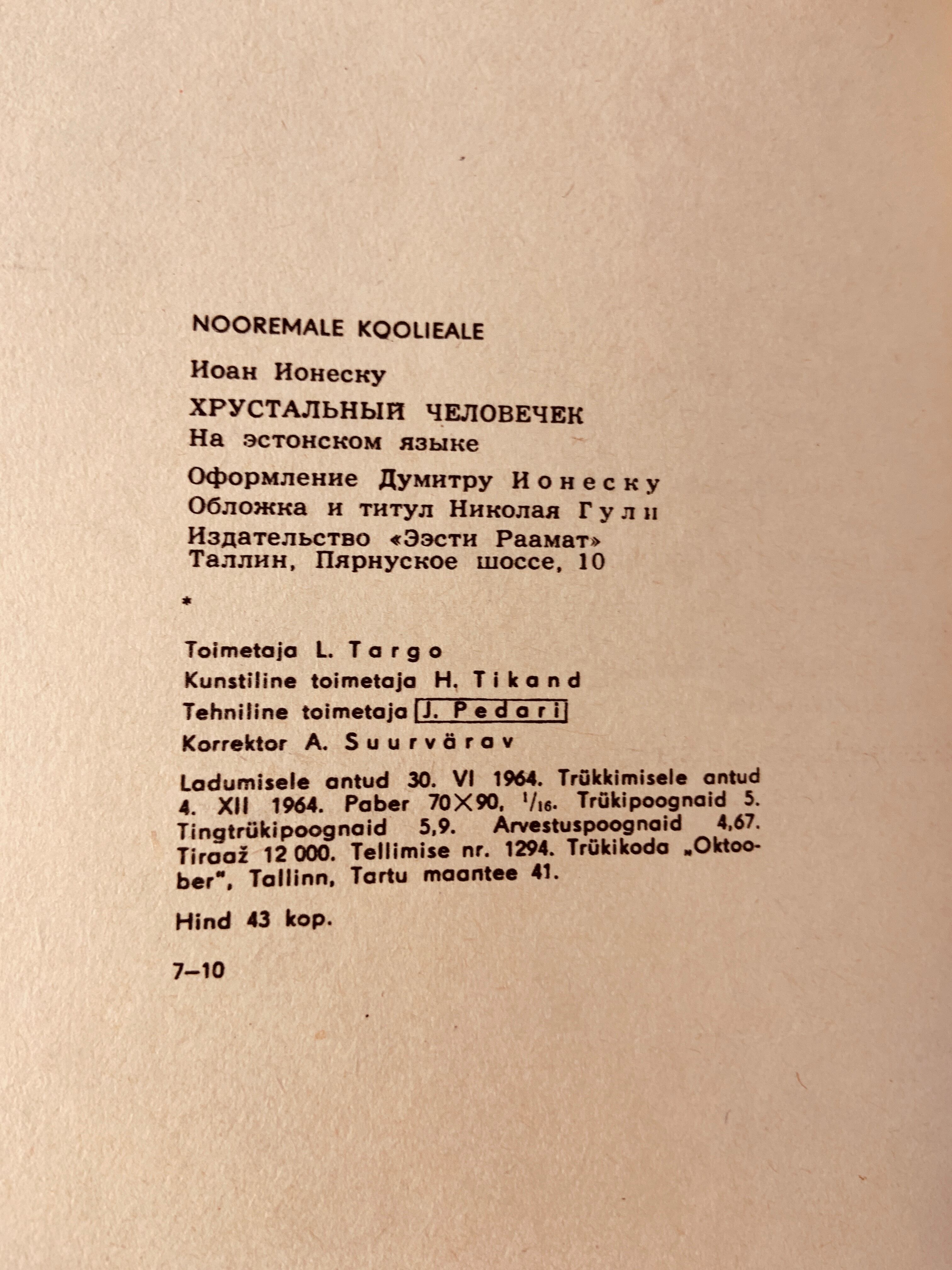 旧ソ連時代のエストニアで出版されたルーマニア出身の作家 Ion Ionescu(イオン・イオネスク)による児童向け書籍。