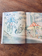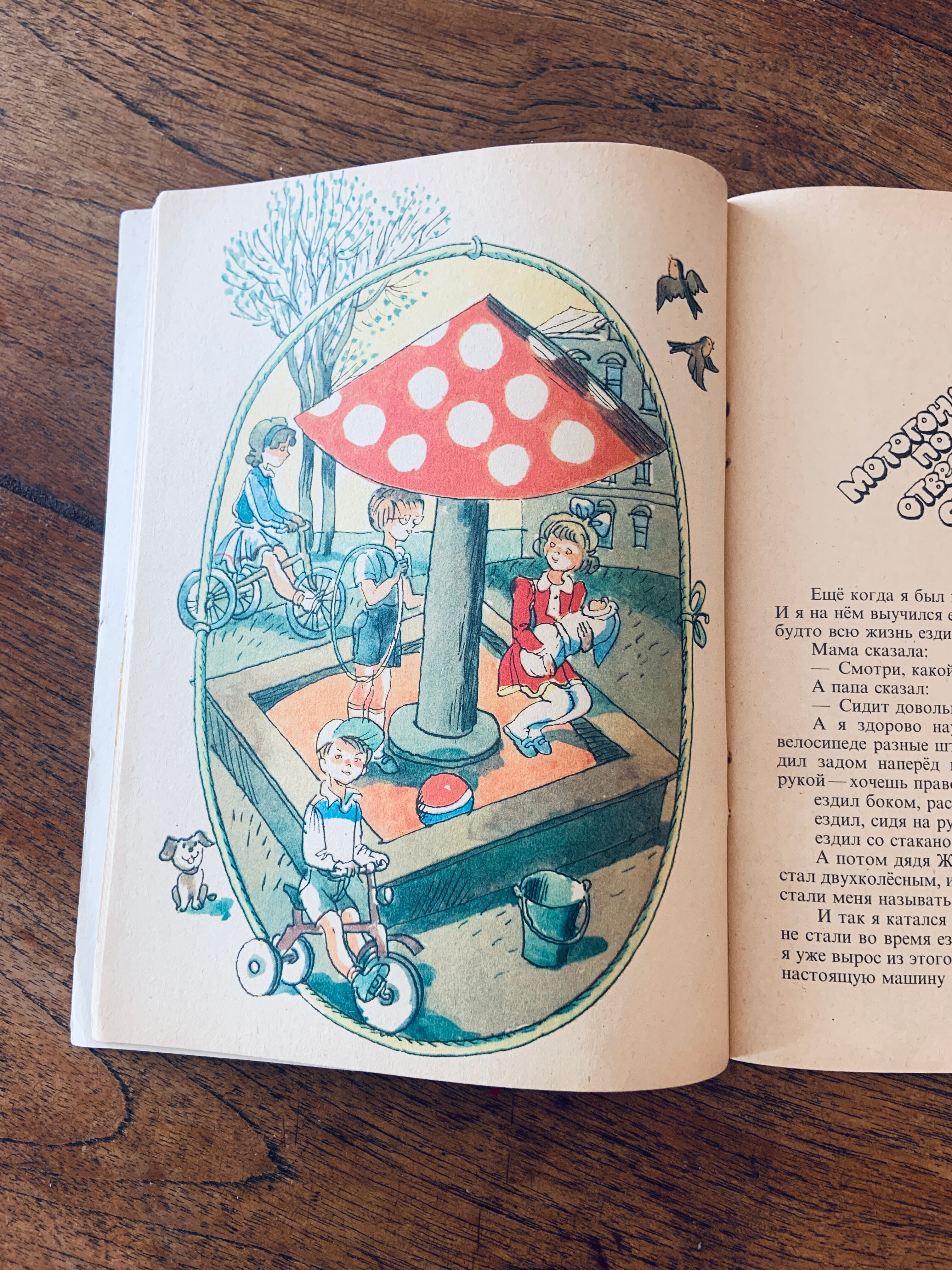 特にソ連時代の子どもたちの生活観や価値観が色濃く反映されており、家族・学校・スポーツイベントを背景にしたエピソードが並んでおり、見開きになったカラーイラストも子どもたちの賑わいがカラフルに描かれています。