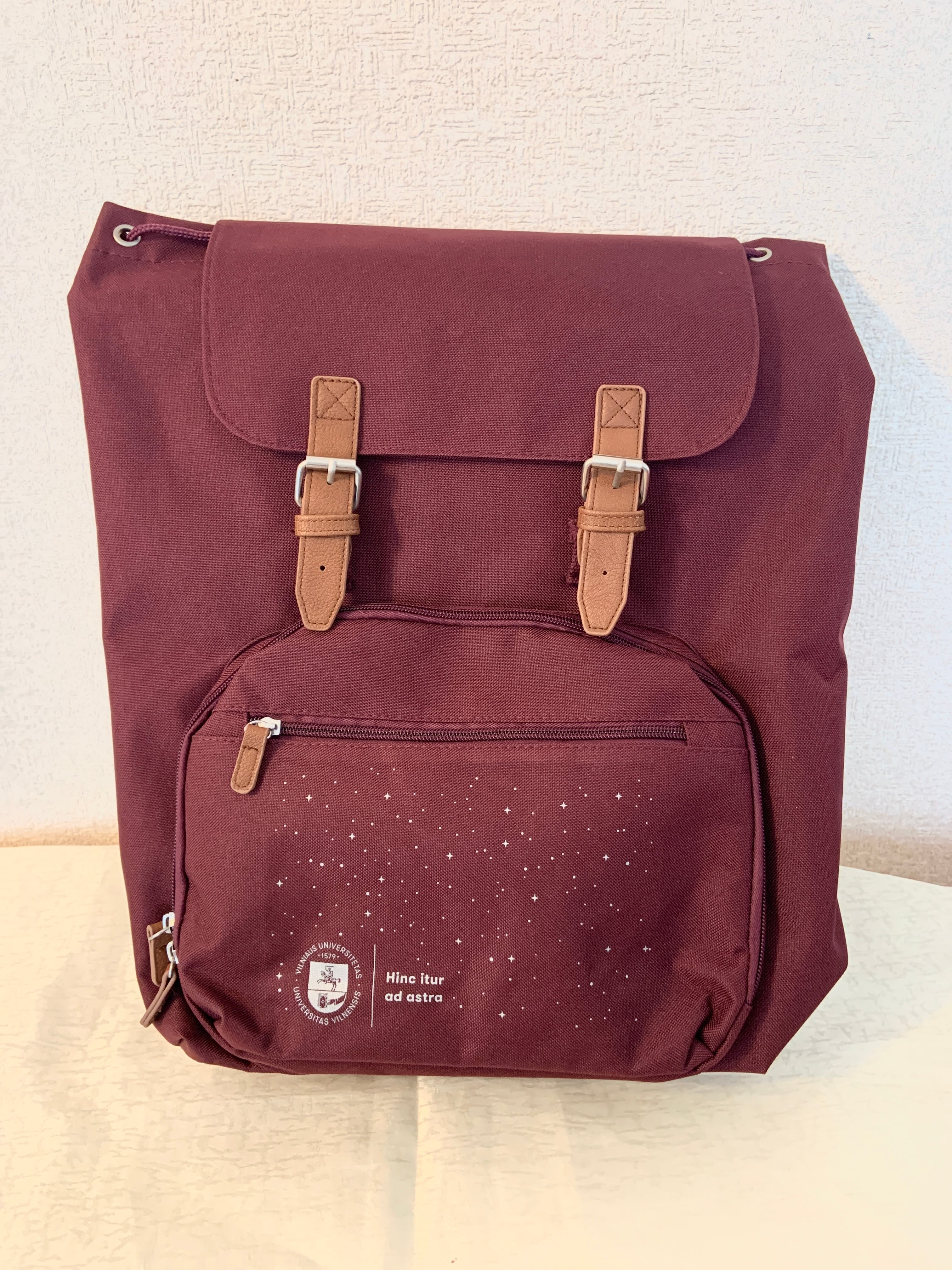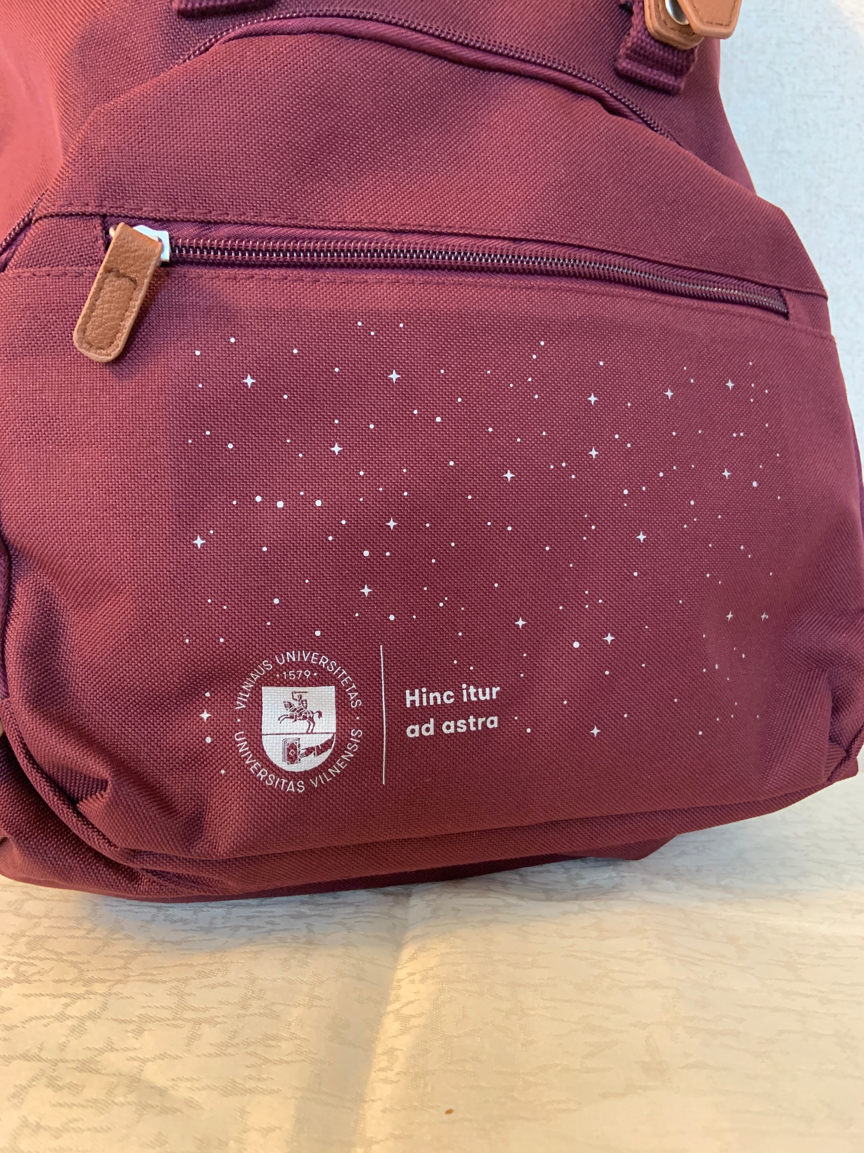 このビリニュス大学カスタムモデルバックパックは、伝統あるヴィリニュス大学のロゴと校訓「Hinc itur ad astra(ここから星へ)」が印象的にデザインされた特別な仕様です。