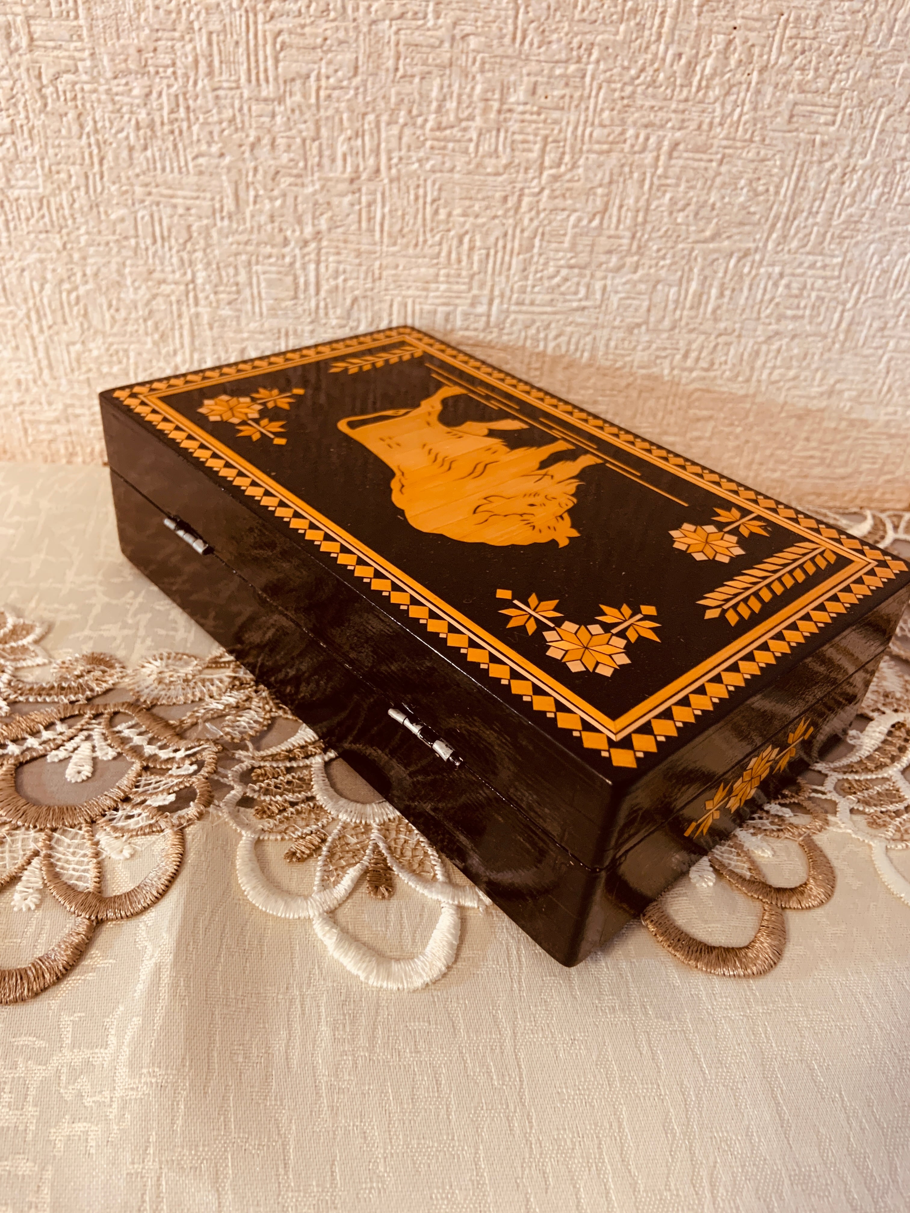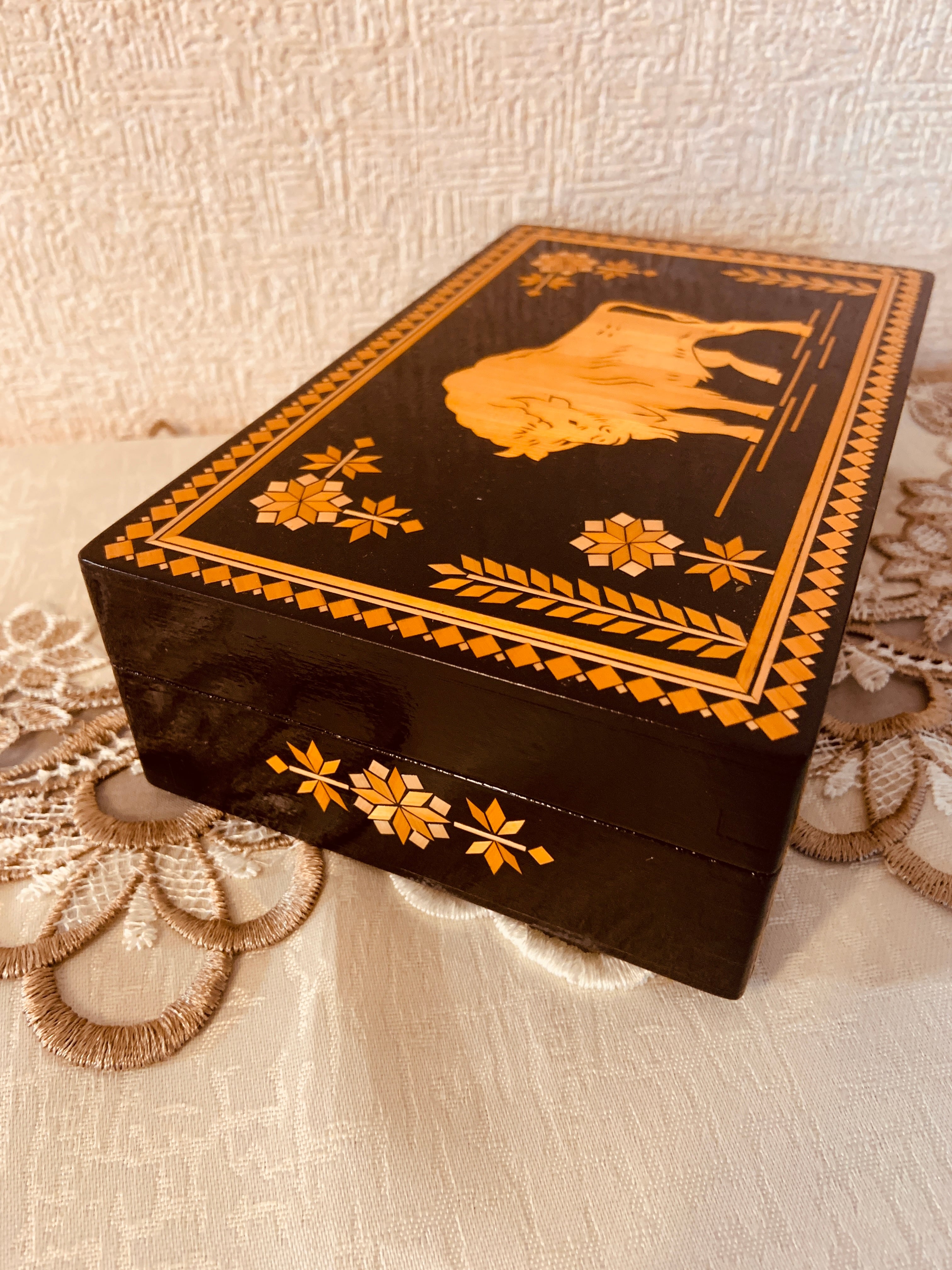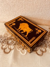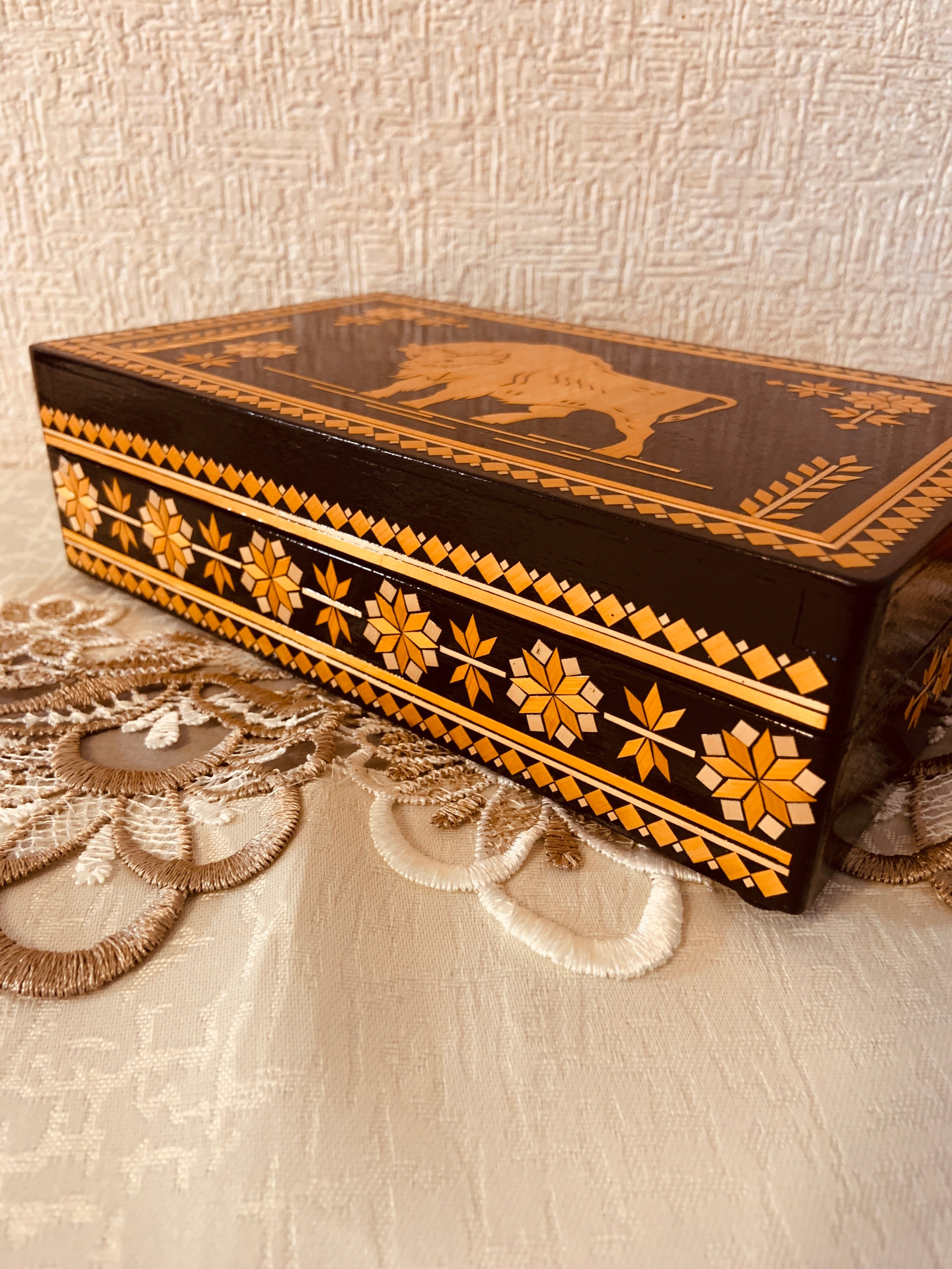 ソ連時代おみやげ木箱 バイソンと植物モチーフの柄
