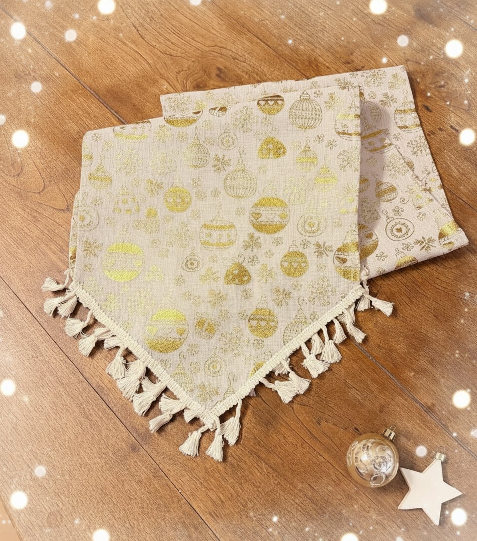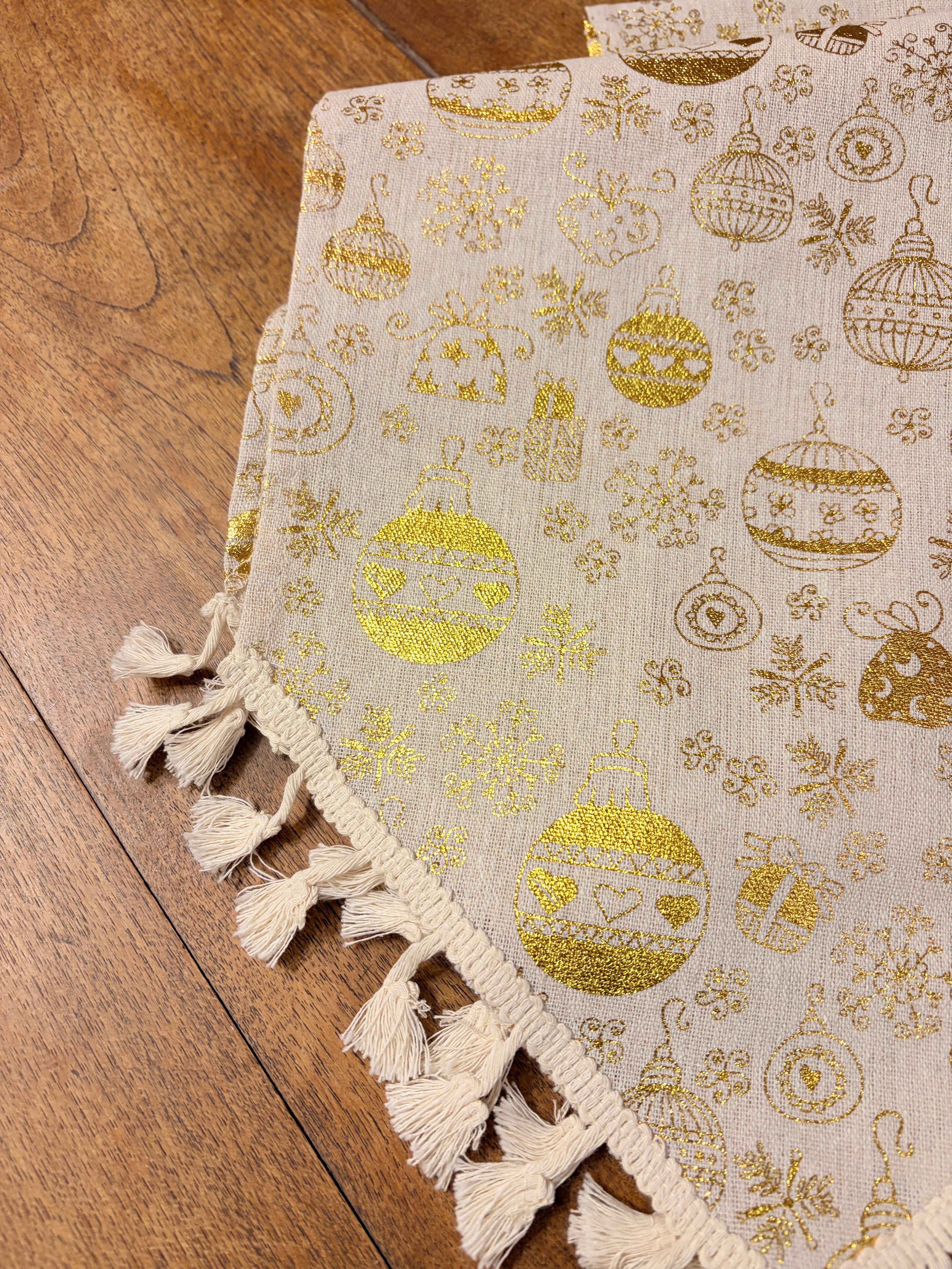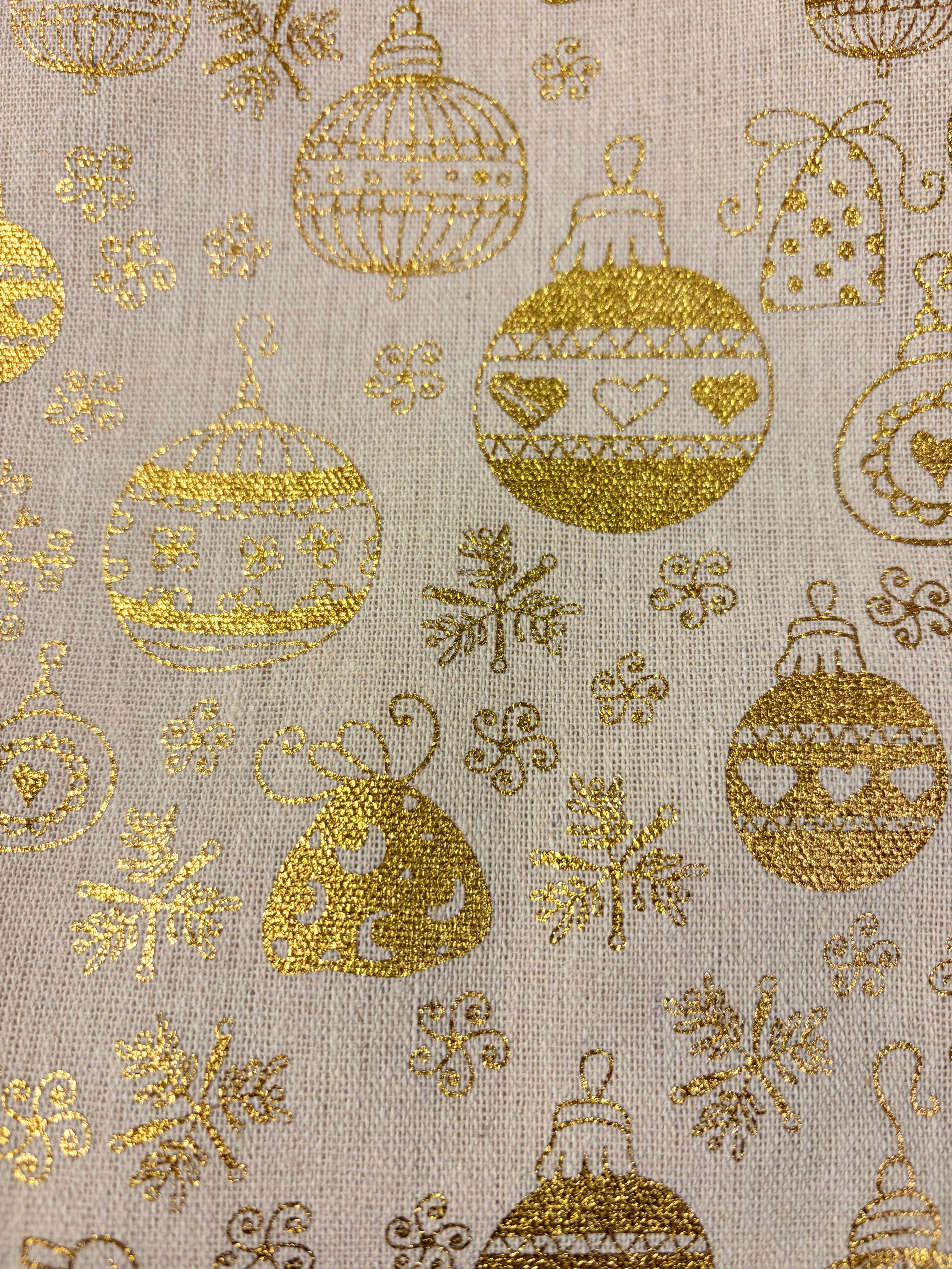 白地に金のクリスマスオーナメントの柄の刺繍が入り、煌びやかな印象を与えます。