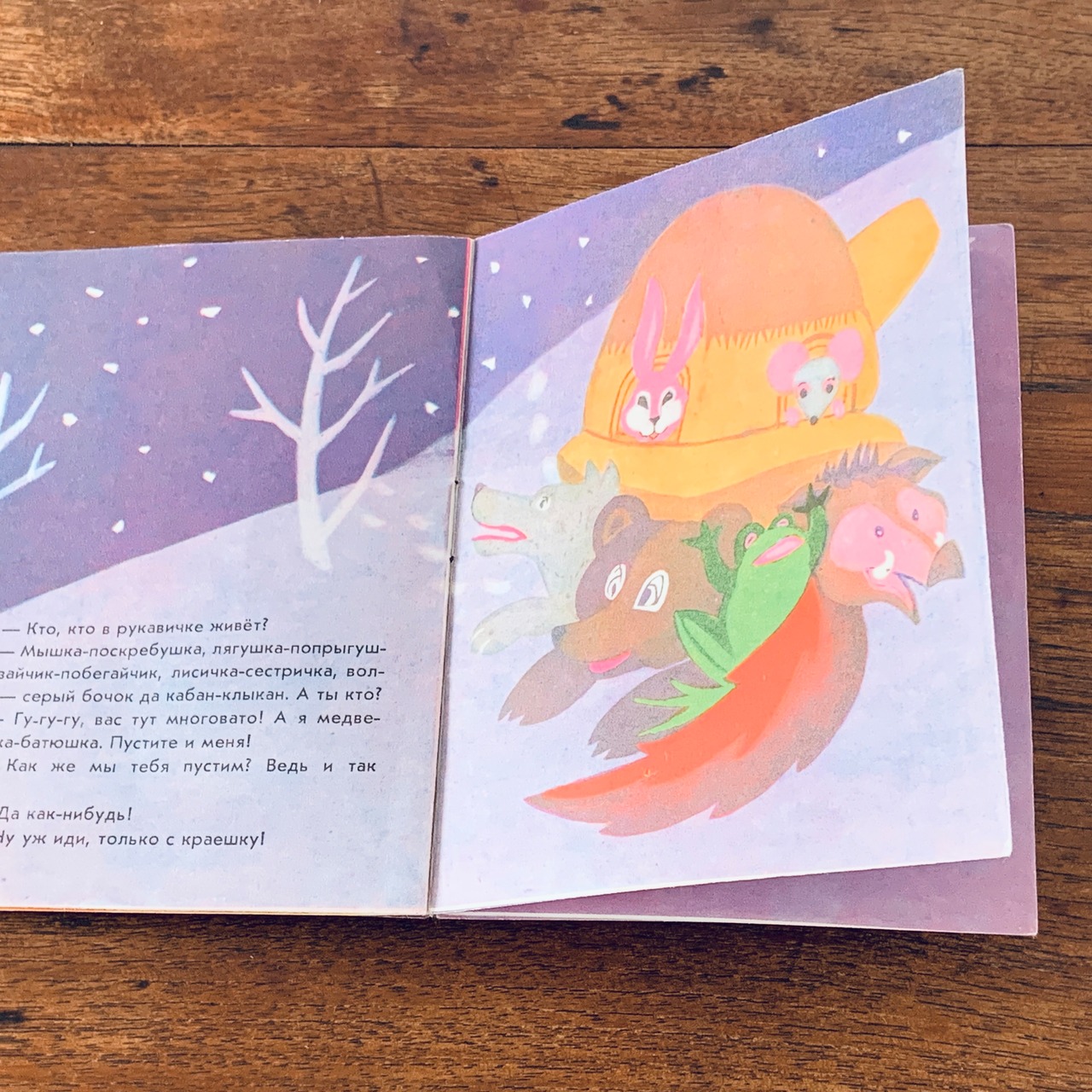 話は温かい家を探した動物たちがおじいさんの落としたミトンに次々と入っていく物語です。